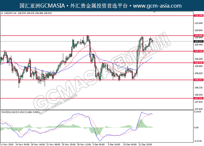 USDJPY, H4: 美日高位承压后回落。MACD多头动能略减,短期可持续关注空头为主。上方关注109.65压力和110.25压力,下方关注109.25支撑和108.95支撑。