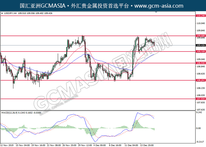 20191218 USDJPY-午间 by keyk | Dec 18, 2019 | 美元兑日元 | 0 comments GCMAsia - USDJPY USDJPY 2019-12-18 USDJPY, H4: 美日高位承压回落。MACD形成死叉,动能略减,短期继续看空走势为主。上方关注109.70压力和110.25压力,下方关注109.25支撑和108.95支撑。