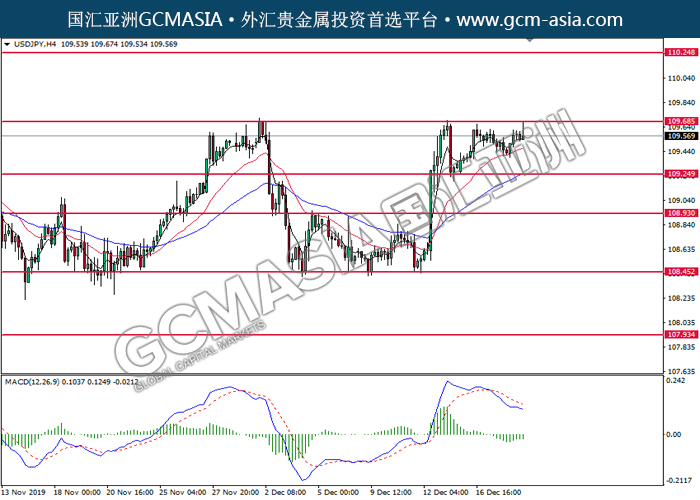 USDJPY, H4: 美日震荡上行,目前测试前期压力。MACD空头动能略减,若突破可关注多头为主。上方关注109.70压力和110.25压力,下方关注109.25支撑和108.95支撑。