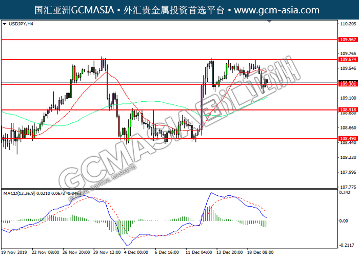 USDJPY, H4: 美日高位承压回落,目前测试前期支撑。然而,MACD空头动能略减,短期可关注技术性回调。上方关注109.65压力和109.95压力,下方关注109.30支撑和108.90支撑。