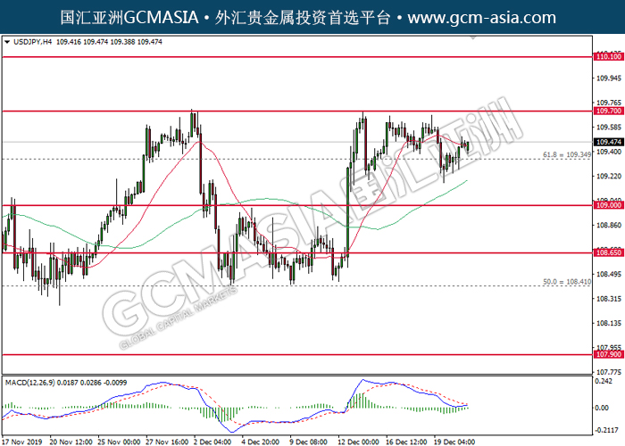 20191223 USDJPY by willy | Dec 22, 2019 | 美元兑日元 | 0 comments GCMAsia - USDJPY USDJPY 2019-12-23 USDJPY,H4:美日低位反弹。MACD空头动能有所略减,短期关注多头势力为主。上方关注109.70压力和110.10压力,下方关注109.35支撑和109.00支撑。