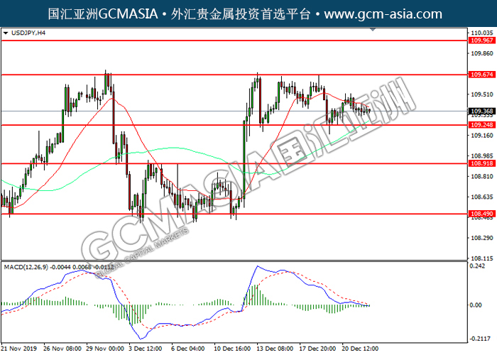 20191224 USDJPY by willy | Dec 24, 2019 | 美元兑日元 | 0 comments GCMAsia - USDJPY USDJPY 2019-12-24 USDJPY, H4: 美日震荡下行。然而,MACD空头动能略减,短期可关注技术性回调。上方关注109.65压力和109.95压力,下方关注109.25支撑和108.90支撑。