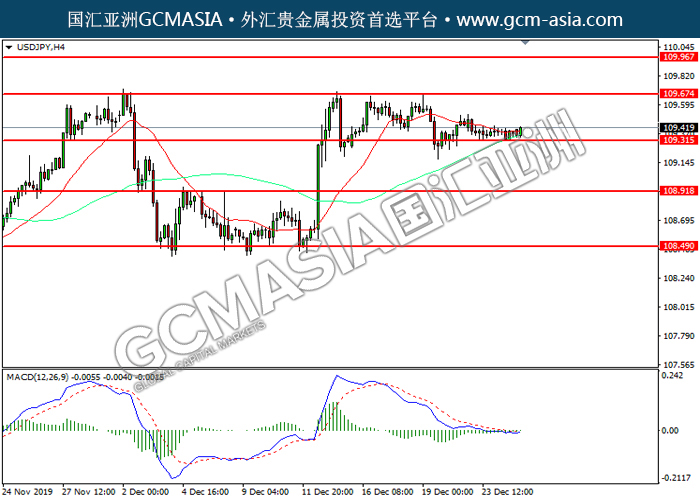 20191226 USDJPY by willy | Dec 26, 2019 | 美元兑日元 | 0 comments GCMAsia - USDJPY USDJPY 2019-12-26 USDJPY, H4: 美日震荡盘整。然而,MACD空头动能略减,短期可关注技术性回调。上方关注109.65压力和109.95压力,下方关注109.30支撑和108.90支撑。