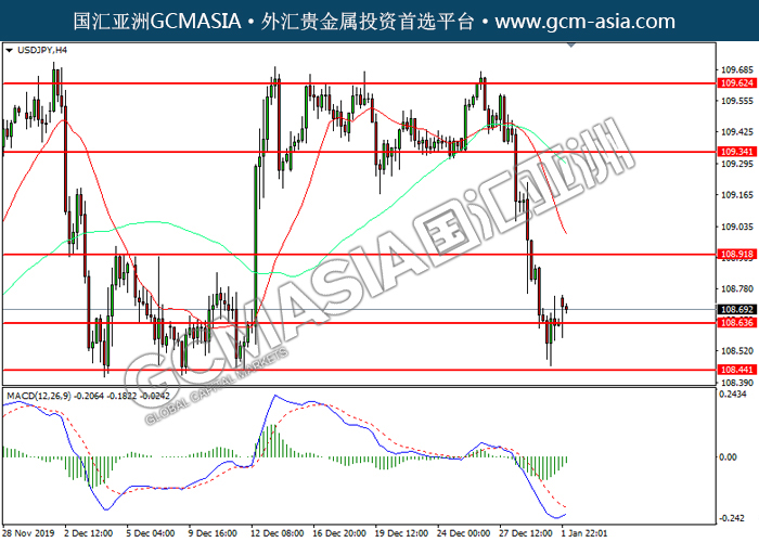 USDJPY, H4: 美日低位反弹。 MACD空头动能略减,短期关注多头为主。上方关注108.90压力和109.35压力,下方关注108.65支撑和108.45支撑。