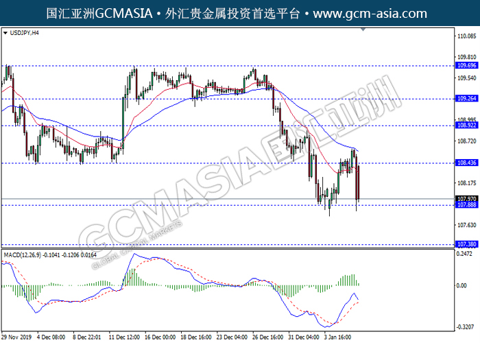 USDJPY, H4: 美日空头排列,目前测试靠近前期支撑。 MACD开始形成死叉,多头动能有所略减,若突破继续关注空头趋势为主。上方关注108.45压力和108.90压力,下方关注107.90支撑和107.40支撑。