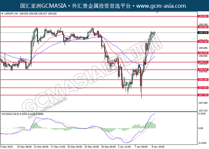 USDJPY, H4: 美日突破后持续上行。然而,MACD多头动能略减,短期可关注技术性回调为主。上方关注109.70压力和110.00压力,下方关注109.25支撑和108.95支撑。