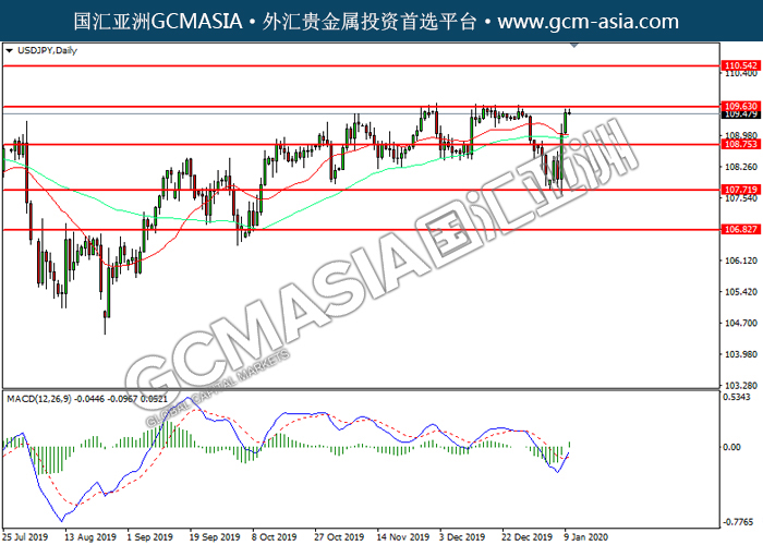 USDJPY, Daily: 美日多头排列,目前测试前期压力。MACD多头动能略增,若突破可关注多头为主。上方关注109.65压力和110.55压力,下方关注108.75支撑和107.70支撑。