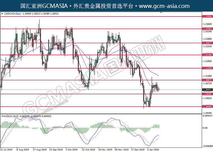 20200117 USDCAD-午间 by keyk | Jan 17, 2020 | 美元兑日元 | 0 comments GCMAsia - USDCAD USDCAD 2020-01-17 USDCAD,Daily:美加受承压回落。MACD多头动能有所略减,短期关注空头势力。上方关注1.3085压力和1.3145压力,下方关注1.3020支撑和1.2960支撑。