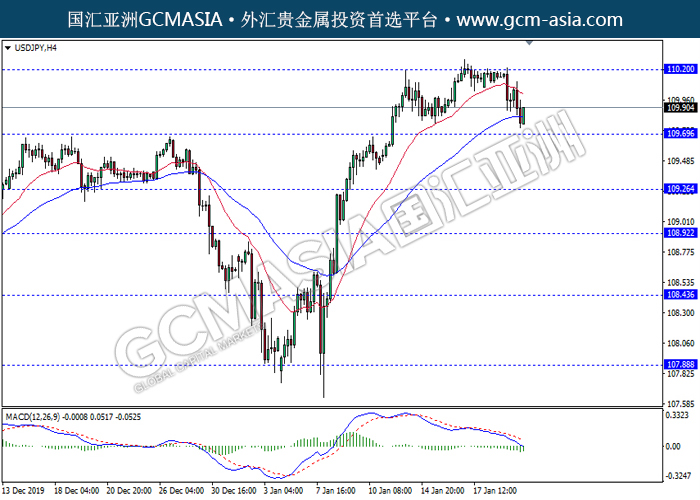 USDJPY,H4:美日高位回落,目前测试靠近前期支撑。MACD动能持续略减,若突破继续关注空头为主。上方关注110.20压力和110.65压力,下方关注109.70支撑和109.25支撑。