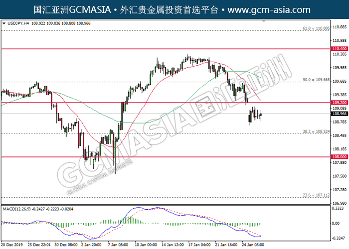 20200128 USDJPY by willy | Jan 28, 2020 | 美元兑日元 | 0 comments GCMAsia - USDJPY USDJPY 2020-01-28 USDJPY,H4:美日低位反弹。MACD空头动能有所略减,短期关注多头势力。上方关注109.20压力和109.65压力,下方关注108.50支撑和108.00支撑。