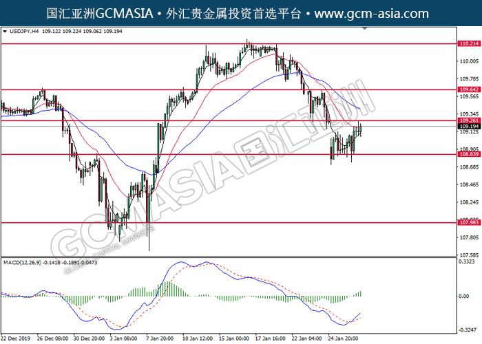 USDJPY,H4:美日低位反弹,目前测试着压力位。MACD多头动能有所略增,若突破关注多头走势。上方关注109.25压力和109.65压力,下方关注108.85支撑和108.00支撑。