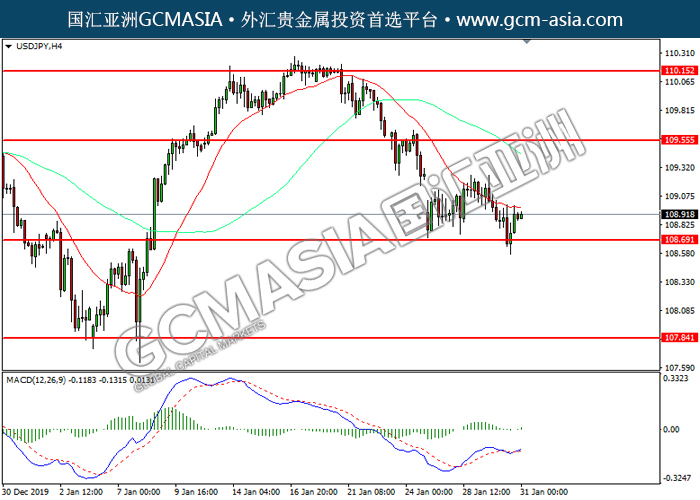 20200131 USDJPY by skylow | Jan 31, 2020 | 美元兑日元 | 0 comments GCMAsia - USDJPY USDJPY 2020-01-31 USDJPY,H4:美日低位反弹。MACD多头动能略增,短期关注多头为主。上方关注109.55压力和110.15压力,下方关注108.70支撑和107.85支撑。