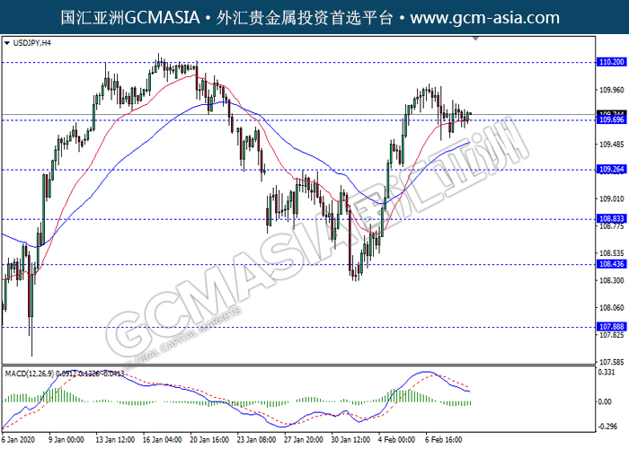 USDJPY,H4:美日震荡盘整,目前测试靠近前期支撑。然而,MACD动能略减,若突破关注空头走势为主。上方关注110.20压力和110.65压力,下方关注109.70支撑和109.25支撑。