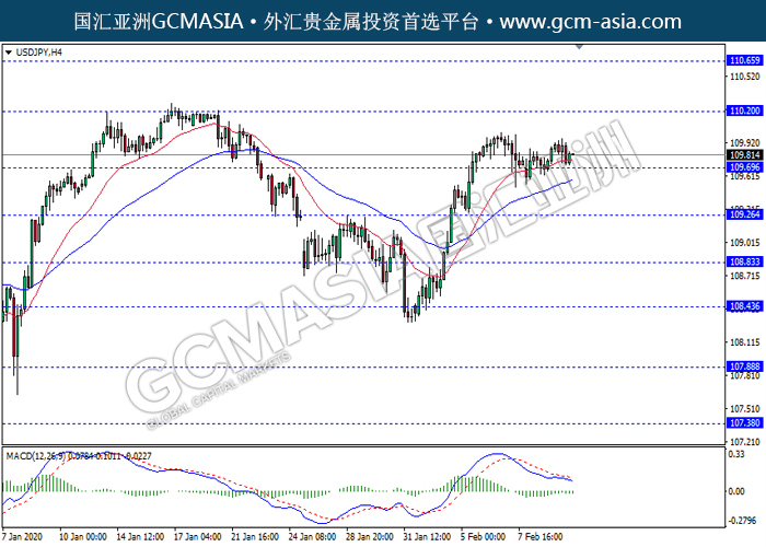 USDJPY,H4:美日震荡盘整,目前测试靠近前期支撑。然而,MACD动能略减,若突破关注空头走势为主。上方关注110.20压力和110.65压力,下方关注109.70支撑和109.25支撑。