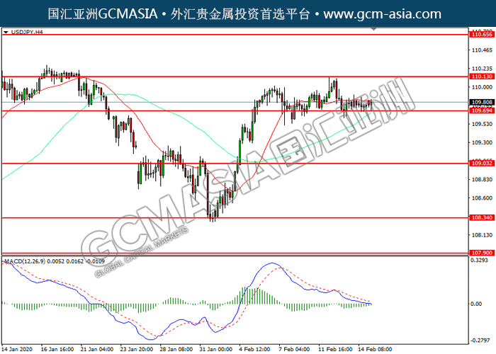 USDJPY, H4: 美日震荡盘整,目前测试前期支撑。 MACD空头动能略减,短期可关注多头为主。上方关注110.15压力和110.65压力,下方关注109.70支撑和109.05支撑。