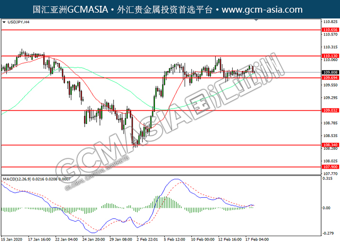 USDJPY, H4: 美日震荡盘整,目前靠近前期支撑。 MACD多头动能略减,短期可关注空头为主。上方关注110.15压力和110.65压力,下方关注109.70支撑和109.05支撑。