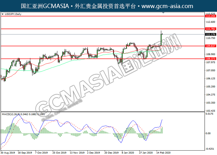 USDJPY, H4: 美日多头排列,目前靠近前期压力。MACD多头动能略增,若突破关注多头为主。上房关注111.80压力和113.25压力,下方关注109.85支撑和108.35支撑。