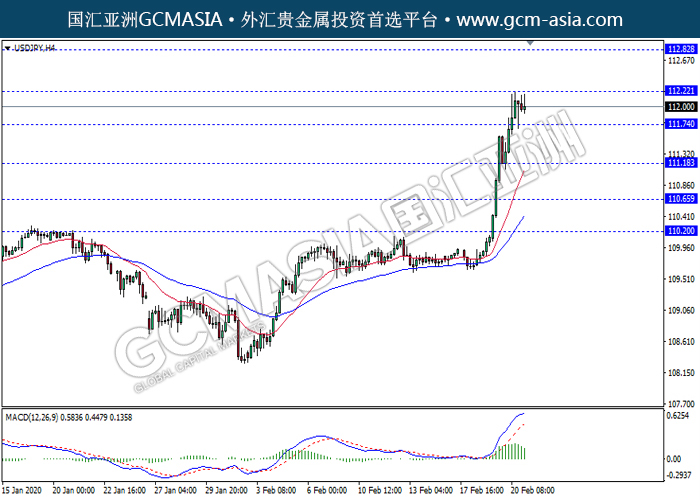 USDJPY, H4: 美日高位承压回落。 MACD多头动能有所略减,短期继续关注空头回调为主。上方关注112.20压力和112.80压力,下方关注111.75支撑和111.20支撑。