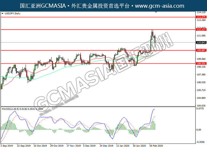 20200225 USDJPY by skylow | Feb 25, 2020 | 美元兑日元 | 0 comments GCMAsia - USDJPY USDJPY 2020-02-25 USDJPY, Daily: 美日高位回落。MACD多头动能略减,短期可关注空头为主。上方关注112.20压力和113.60压力,下方关注109.95支撑和108.55支撑。