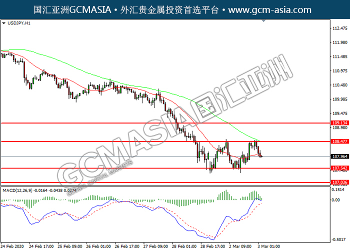 20200303 USDJPY-午间 by keyk | Mar 3, 2020 | 美元兑日元 | 0 comments GCMAsia - USDJPY USDJPY 2020-03-03 USDJPY, H1: 美日高位回落。 MACD多头动能有所略减,短期关注空头为主。上方关注108.45压力和109.15压力,下方关注107.55支撑和107.05支撑。