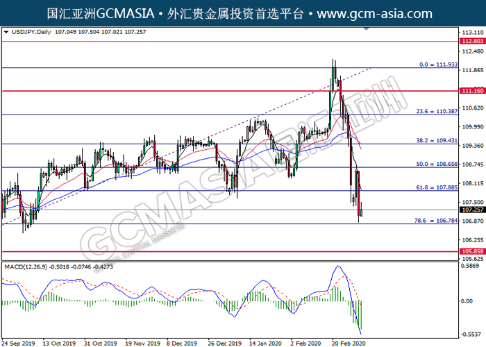 USDJPY, Daily: 美日震荡下行。 MACD空头动能有所略增,中期可关注空头为主。上方关注107.90压力和108.65压力,下方关注106.80支撑和105.85支撑。