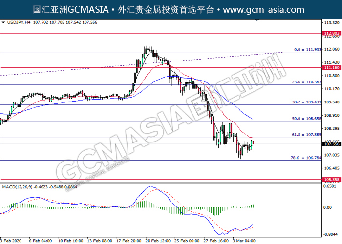 20200305 USDJPY by skylow | Mar 5, 2020 | 美元兑日元 | 0 comments GCMAsia - USDJPY USDJPY 2020-03-05 USDJPY,H4:美日低位反弹。MACD多头动能偏强,短期关注多头为主。上方关注107.90压力和108.65压力,下方关注106.70支撑和105.85支撑。