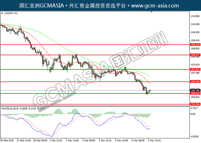 USDJPY, H1: 美日震荡下行,目前靠近前期支撑。 然而,MACD空头动能有所略减,短期可关注技术性回调为主。上方关注106.80压力和107.55压力,下方关注106.05支撑和105.35支撑。