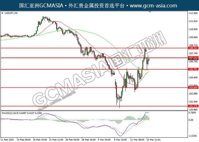 USDJPY,H4:美日低位反弹,目前测试前期压力。然而,MACD多头动能略减,短期关注技术性回调。上方关注107.20压力和108.35压力,下放关注105.80支撑和103.60支撑。
