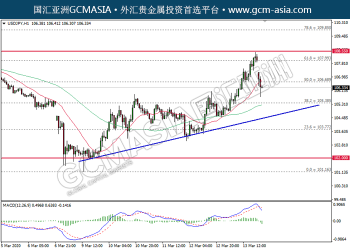 USDJPY,H1:美日空头排列。MACD已形成死叉,动能转弱,短期关注空头势力为主。上方关注106.70压力和108.00压力,下放关注105.40支撑和103.80支撑。