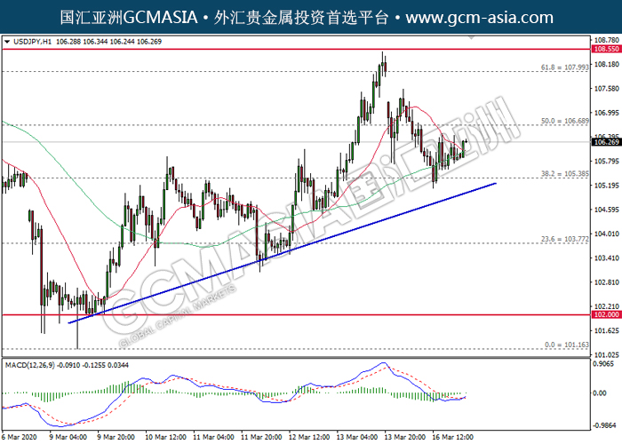 20200317 USDJPY by willy | Mar 16, 2020 | 美元兑日元 | 0 comments GCMAsia - USDJPY USDJPY 2020-03-17 USDJPY,H1:美日低位反弹。MACD空头动能有所略减,短期关注多头势力。上方关注106.70压力和108.00压力,下方关注105.40支撑和103.80支撑。