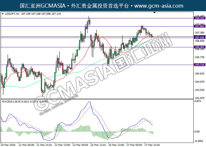 USDJPY,H1:美日震荡下行,目前测试前期支撑。MACD空头动能略增,若下破可关注空头为主。上方关注107.80压力和108.35压力,下方关注107.05支撑和106.40支撑。
