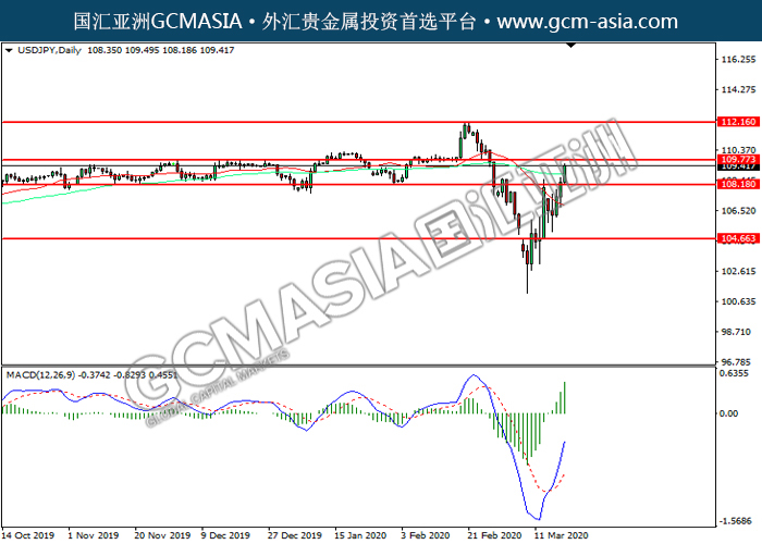 USDJPY,Daily:美日震荡上行,目前测试前期压力。MACD多头动能略增,若突破可关注多头为主。上方关注109.75压力和112.15压力,下方关注108.20支撑和104.65支撑。