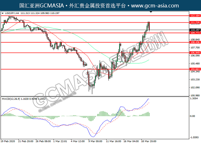 20200320 USDJPY-午间 by keyk | Mar 20, 2020 | 美元兑日元 | 0 comments GCMAsia - USDJPY USDJPY 2020-03-20 USDJPY, H4: 美日高位回落。MACD多头动能略减,短期可关注空头为主。上方关注111.20压力和112.15压力,下方关注109.75支撑和108.45支撑。