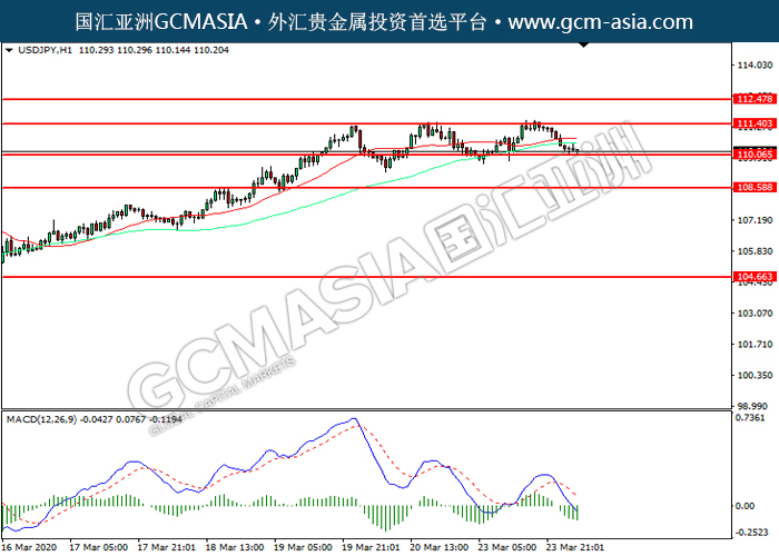 USDJPY, H1: 美日震荡下行,目前测试前期支撑。MACD空头动能略增,若下破可关注空头为主。上方关注111.40压力和112.45压力,下方关注110.05支撑和108.60支撑。