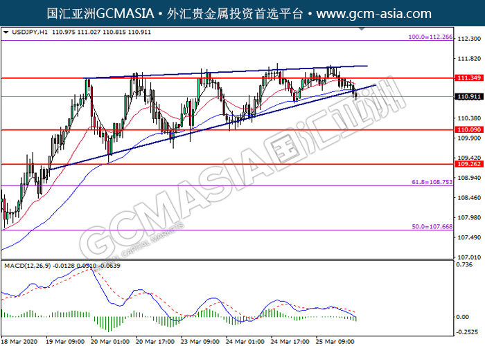 USDJPY,H1:美日突破上升楔形底部后持续下行。MACD转向空头,动能略减,短期可关注空头为主。上方关注111.35压力和112.25压力,下方关注110.10支撑和109.25支撑。