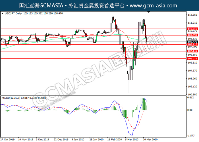 USDJPY,Daily:美日空头排列,目前靠近前期支撑。MACD多头动能略减,若下破可关注空头为主。上方关注109.40压力和110.30压力,下方关注108.10支撑和107.15支撑。