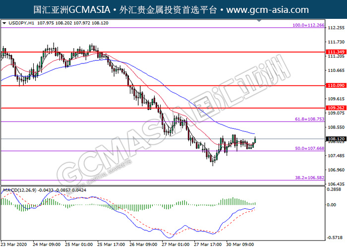 20200331 USDJPY by willy | Mar 31, 2020 | 美元兑日元 | 0 comments GCMAsia - USDJPY USDJPY 2020-03-31 USDJPY,H1:美日低位反弹。MACD转向多头,动能偏强,短期可关注多头为主。上方关注108.75压力和109.25压力,下方关注107.65支撑和106.60支撑。
