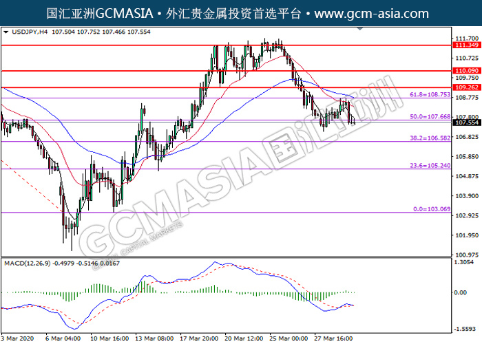 20200401 USDJPY by willy | Apr 1, 2020 | 美元兑日元 | 0 comments GCMAsia - USDJPY USDJPY 2020-04-01 USDJPY,H4:美日突破后持续下行。MACD转向空头,动能略减,短期可关注空头为主。上方关注107.65压力和108.75压力,下方关注106.60支撑和105.25支撑。