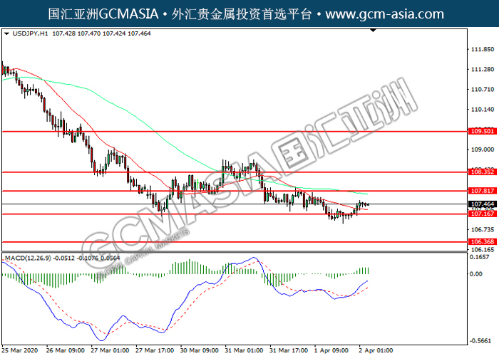 20200402 USDJPY-午间 by keyk | Apr 2, 2020 | 美元兑日元 | 0 comments GCMAsia - USDJPY USDJPY 2020-04-02 USDJPY,H1:美日震荡上行。MACD多头动能略增,短期可持续关注多头为主。上方关注107.80压力和108.35压力,下方关注107.15支撑和106.35支撑。