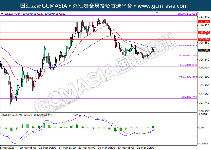 USDJPY,H4:美日低位反弹,目前测试着压力位。MACD显示多头动能偏强,短期可关注多头为主。上方关注108.30压力和109.25压力,下方关注107.15支撑和106.00支撑。