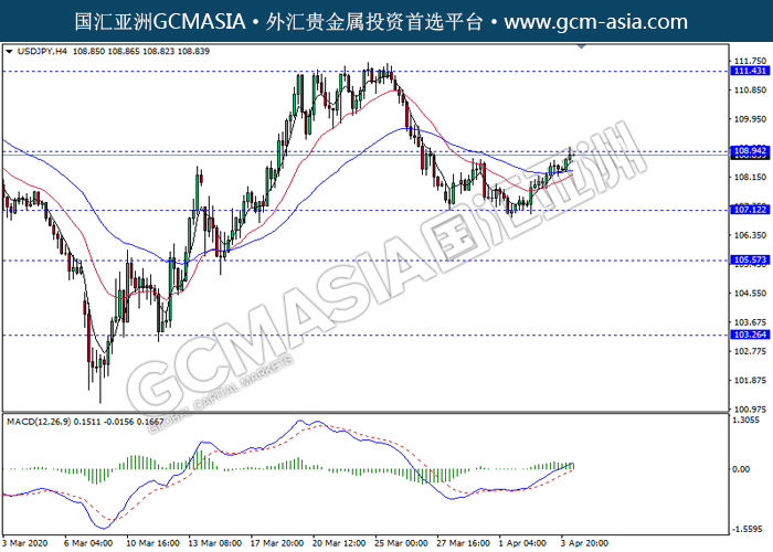 USDJPY,H4:美日震荡上行,目前测试着压力位。MACD显示多头动能偏强,若突破继续关注多头趋势为主。上方关注108.95压力和111.45压力,下方关注107.10支撑和105.55支撑。