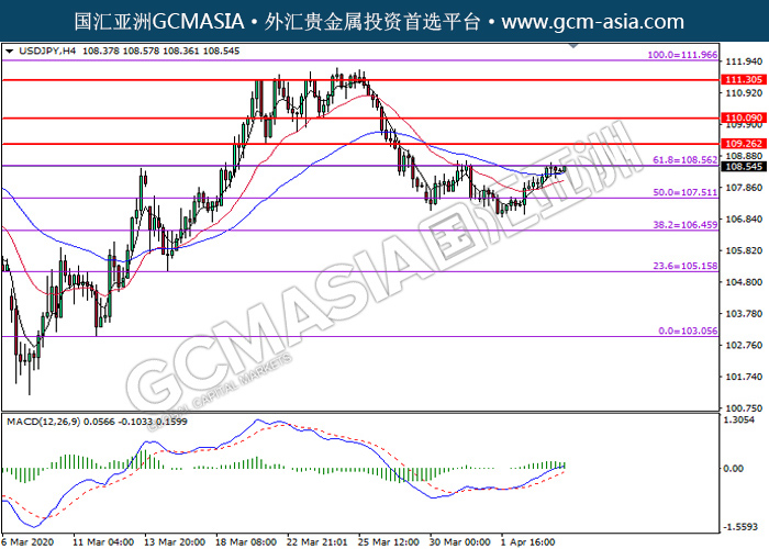 USDJPY,H4:美日震荡上行,目前测试着压力位。MACD显示多头动能略增,若突破可关注多头为主。上方关注108.55压力和109.25压力,下方关注107.50支撑和106.45支撑。