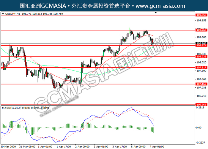 USDJPY,H1:美日高位回落,目前测试前期支撑。MACD空头动能略增,若突破可关注空头为主。上方关注109.25压力和109.85压力,下方关注108.65支撑和108.25支撑。