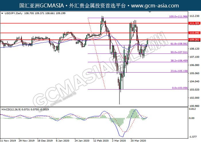 USDJPY,Daily:美日震荡上行,目前测试着压力位。MACD显示空头动能略减,若突破可关注多头为主。上方关注109.25压力和110.10压力,下方关注108.55支撑和107.50支撑。