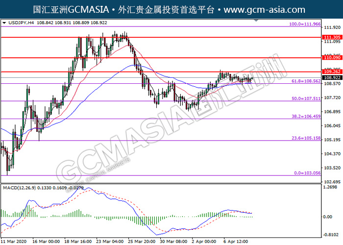 20200409 USDJPY by willy | Apr 9, 2020 | 美元兑日元 | 0 comments GCMAsia - USDJPY USDJPY 2020-04-09 USDJPY,H4:美日地位反弹。MACD显示空头动能略减,短期可关注多头为主。上方关注109.25压力和110.10压力,下方关注108.55支撑和107.50支撑。