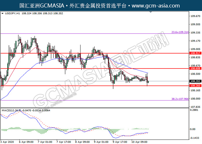 USDJPY,H1:美日高位成压后回落。MACD转向空头,动能略减,短期可关注空头为主。上方关注108.60压力和108.90压力,下方关注108.25支撑和107.95支撑。