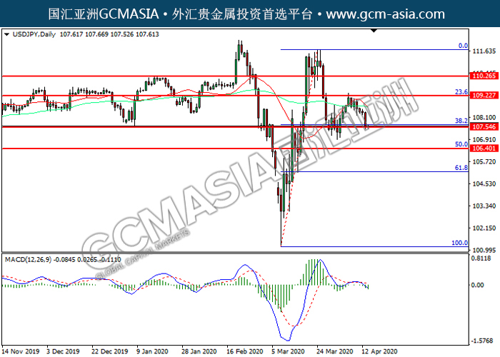USDJPY,Daily:美日震荡下行,目前测试前期支撑。MACD转向空头,动能略减,若下破可持续关注空头为主。上方关注109.25压力和110.25压力,下方关注107.55支撑和106.40支撑。