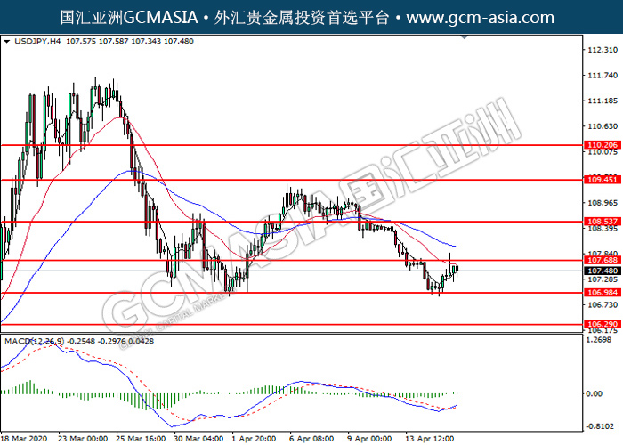 20200416 USDJPY by willy | Apr 16, 2020 | 美元兑日元 | 0 comments GCMAsia - USDJPY USDJPY 2020-04-16 USDJPY,H4:美日地位反弹。MACD转向多头,动能略增,短期可持续关注多头为主。上方关注107.70压力和108.55压力,下方关注107.00支撑和106.30支撑。