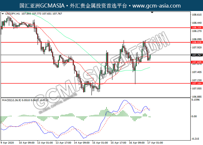 20200417 USDJPY-午间 by keyk | Apr 17, 2020 | 美元兑日元 | 0 comments GCMAsia - USDJPY USDJPY 2020-04-17 USDJPY,H1:美日低位反弹。然而,MACD已形成死叉,动能转弱,短期可关注技术性回调。上方关注108.05压力和108.35压力,下方关注107.60支撑和107.15支撑。