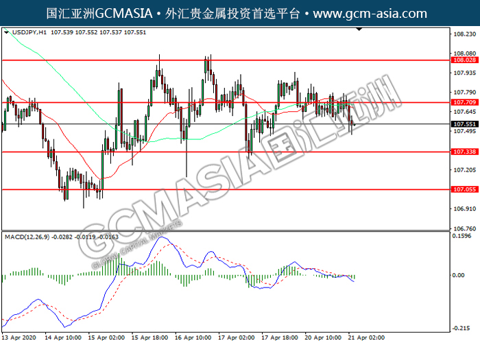 20200421 USDJPY-午间 by keyk | Apr 21, 2020 | 美元兑日元 | 0 comments GCMAsia - USDJPY USDJPY 2020-04-21 USDJPY,H1:美日高位回落。MACD空头动能略增,短期可持续关注空头为主。上方关注107.70压力和108.05压力,下方关注107.35支撑和107.05支撑。
